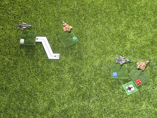 I played the strike mission scenario against my twelve year old daughter today and, as usual, got thrashed. She took the FAE Jaguars on a ground strike mission against a jungle airstrip while I took the FAP Mirage 2000 defenders. It started badly for me when the randomised entry point for the Jaguars ended up on the Peruvian's six, requiring some frantic manoeuvring to get out of missile arc in the first turn. Things went from bad to worse when one of the Jaguar pilots got a partial lock on to a Mirage, fired his R550 Matra Magic and scored three critical hits (!) despite an unsuccessful evasive manoeuvre by the Peruvian.
