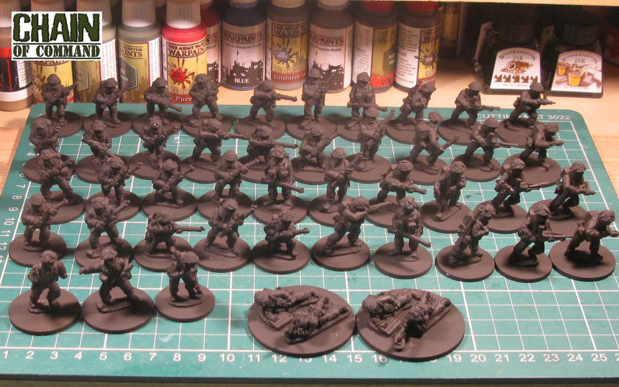 I have made some good progress this afternoon on cleaning up and basing the core platoon for the Chain of Command summer project. As you can see this consists of three rifle sections including a Bren gun team and a Junior Leader each, together with the platoon HQ of a 2'' mortar and PIAT team, a platoon sergeant Senior Leader and a lieutenant Senior Leader. I also added a support unit in the form of a platoon medic, using a Warlord Games figure with a Crusader Miniatures head attached, so that it blended in better with the other figures. The Crusader figures have virtually no flash or seams to remove and are really nice models, so I am going to add a fourth rifle section as a support unit in the initial painting plan while the rest of the support units will wait until the second phase.